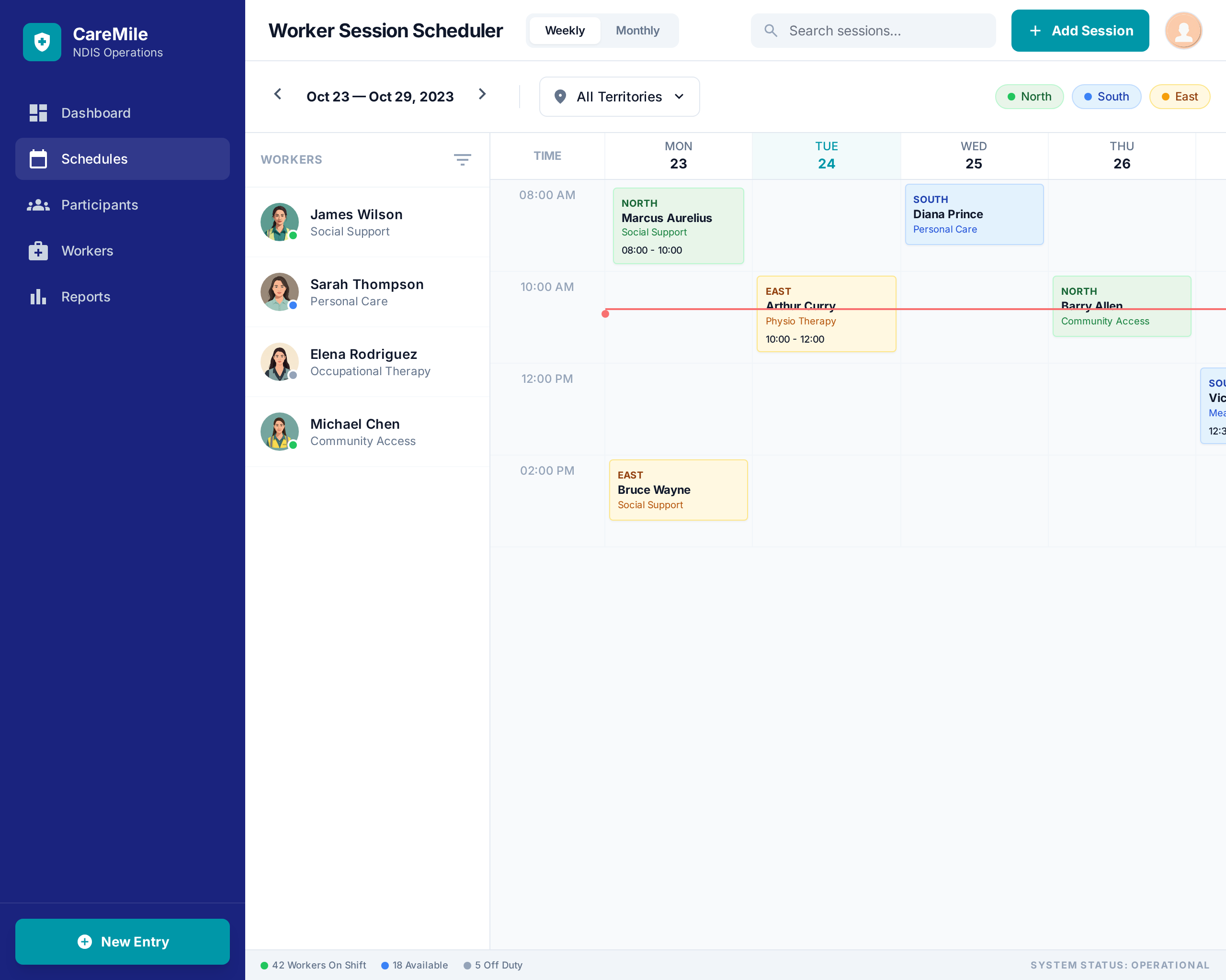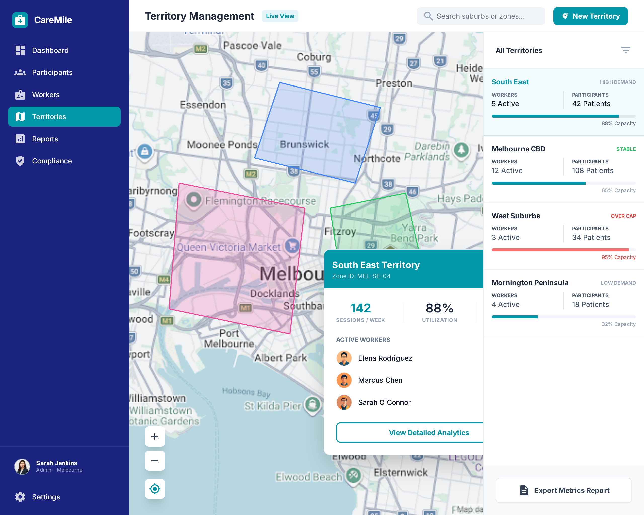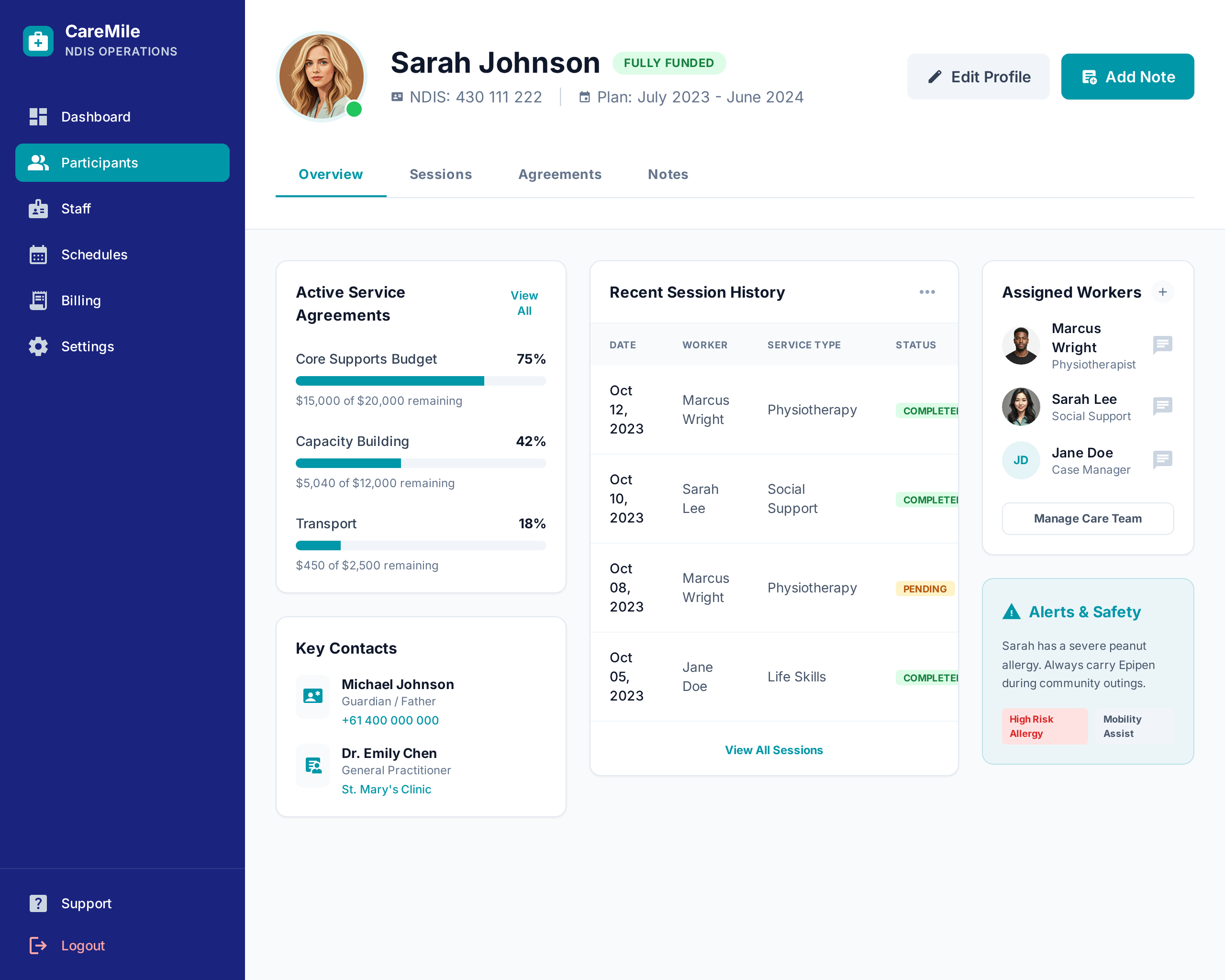 CareMile needed a unified system to manage their full operation — employees, contractors, client sessions, scheduling, territory coverage, agreements, and NDIS compliance reporting — replacing fragmented tools that could not scale with the growing number of participants and service areas across Melbourne.