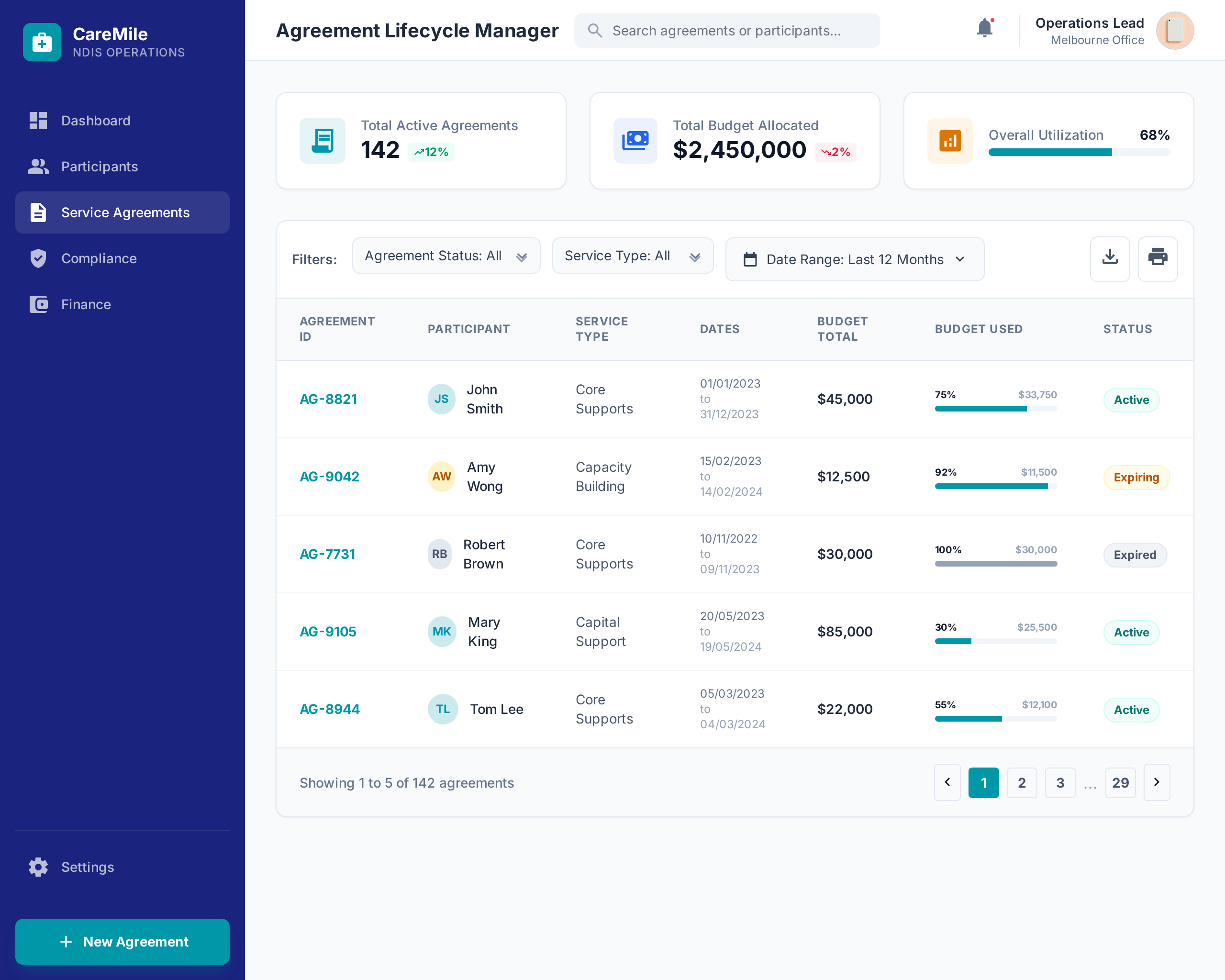 The platform serves every role in CareMile's operation. Administrators manage the full system configuration — modules, permissions, territories, agreement templates, and reporting dashboards. Support coordinators handle participant onboarding, NDIS plan setup, session scheduling, and contractor assignment based on availability, location, and qualifications.