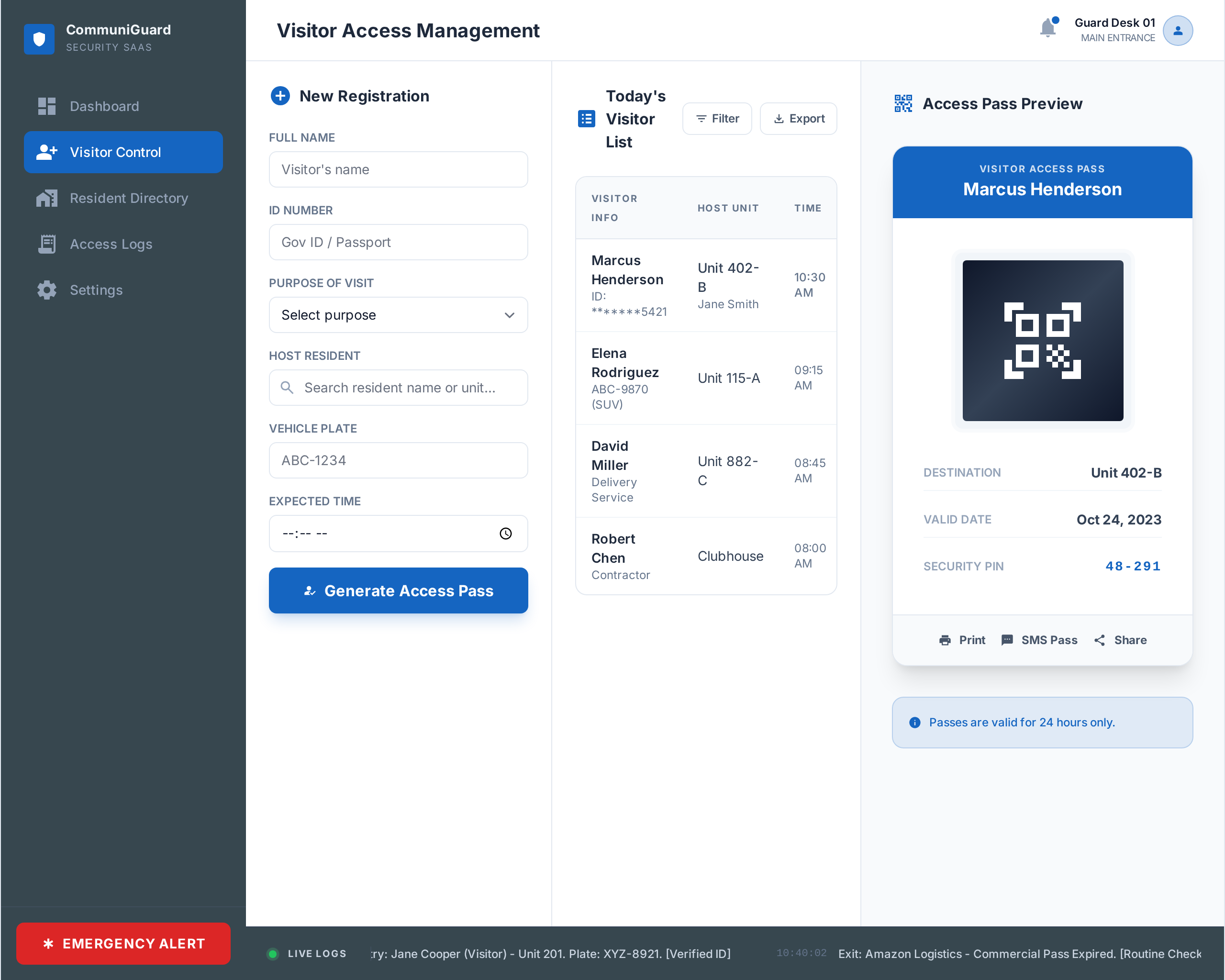 - Implement a visitor pre-registration and verification system that lets residents authorize visitors in advance and gives security guards reliable data to control compound access.