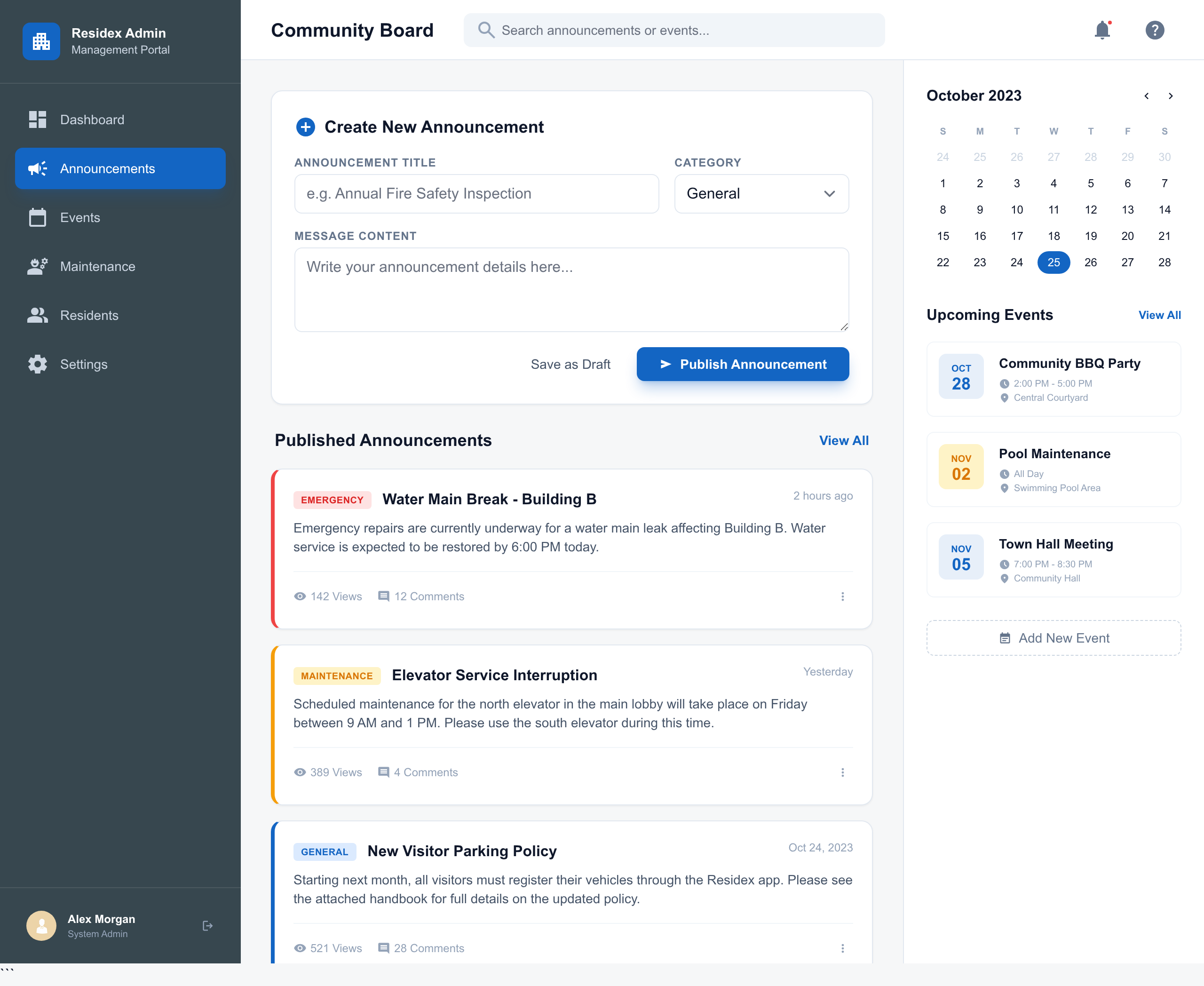 Residents use the platform daily to check their billing status, submit maintenance requests, pre-register visitors, and read community announcements. The interface gives them transparency into what they owe, what issues are being addressed, and what events or maintenance schedules are coming up.
