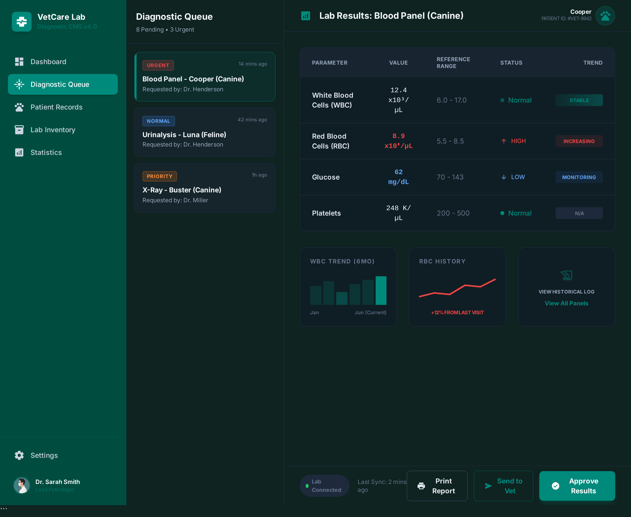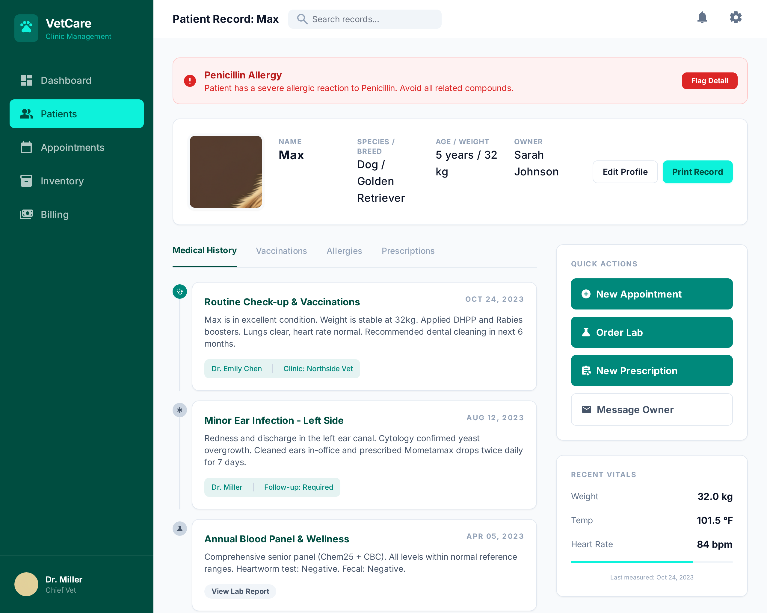 - Centralize all pet and patient data — medical histories, vaccinations, allergies, lab results, and ICU records — so veterinary professionals have instant access to complete information at the point of care.