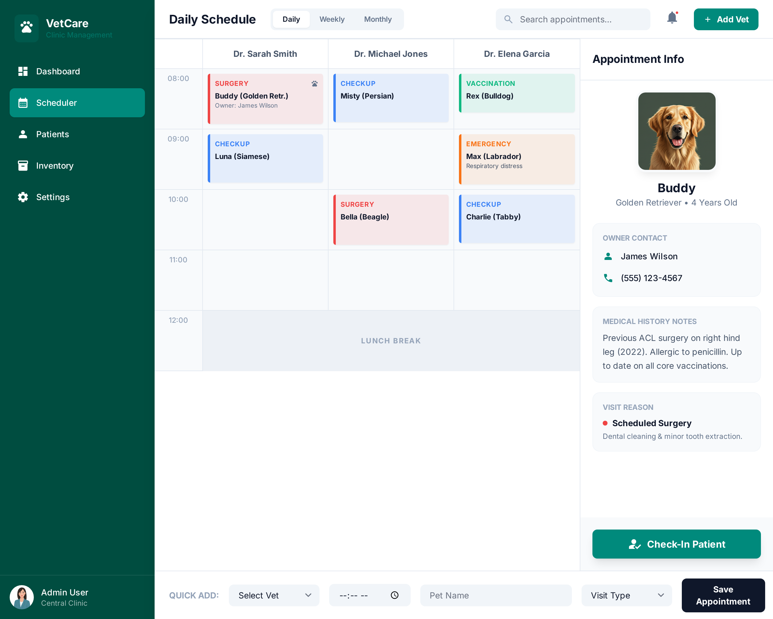 Veterinary clinics manage a complex mix of patient records, appointment scheduling, lab workflows, ICU monitoring, inventory, billing, and staff coordination — often across disconnected tools that lead to data gaps, scheduling conflicts, and inefficient day-to-day operations. No off-the-shelf solution addressed the full scope of clinic needs in one integrated platform.